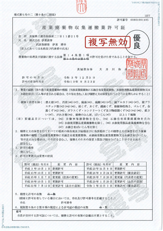 平成26年9月産業廃棄物収集運搬業にて優良認定を取得、優良企業を継続します。